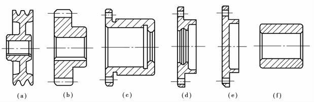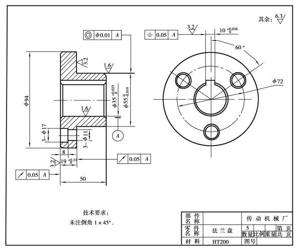 盤套類零件的種類很多,如圖5.3.14所示,按用途大致可分為傳動輪、軸承套、軸承端蓋和套筒等,其結(jié)構(gòu)基本類似。位置精度主要有外圓對內(nèi)孔軸線的徑向圓跳動(或同軸度)、端面對內(nèi)孔軸線的端面圓跳動(或垂直度)等?,F(xiàn)以圖5.3.15所示的法蘭盤為例介紹一般盤套類零件的基本工藝過程。