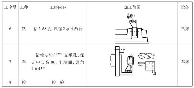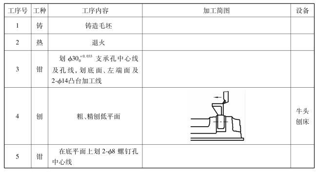 注:因本支架剛性較好,技術(shù)要求也不很高,故粗、精加工不必分開,也不安排時效處理。
