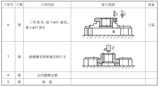 該法蘭的結(jié)構(gòu)特點是中孔回轉(zhuǎn)體,帶有鍵槽和法蘭螺栓孔。其關(guān)鍵的技術(shù)要求有:φ550-0.019外圓表面對φ350+0.025孔基準軸線的同軸度要求;兩端面相對基準軸線的端面圓跳動要求;各表面粗糙度R a值均在1.6以上,尺寸精度等級IT7~IT6。故可按回轉(zhuǎn)面在車床上加工,鍵槽在插床上加工,粗、精加工分開來安排工藝過程,見表5.3.8。