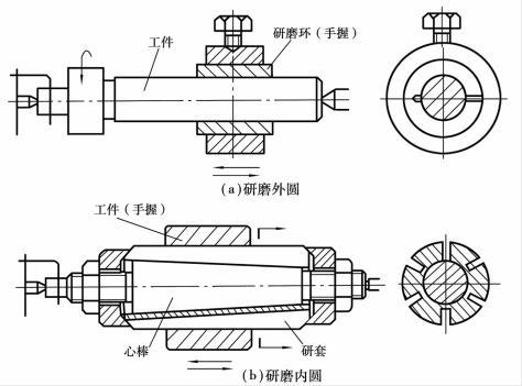 在車床上研磨外圓和內圓的方法如圖5.4.1所示。首先在工件和研具之間涂上研磨劑,由車床主軸帶動工件(或磨具)以20~40 m/min的速度旋轉,手持研具(或工件)作軸向移動進行研磨。并經常檢測工件,直至合格為止。