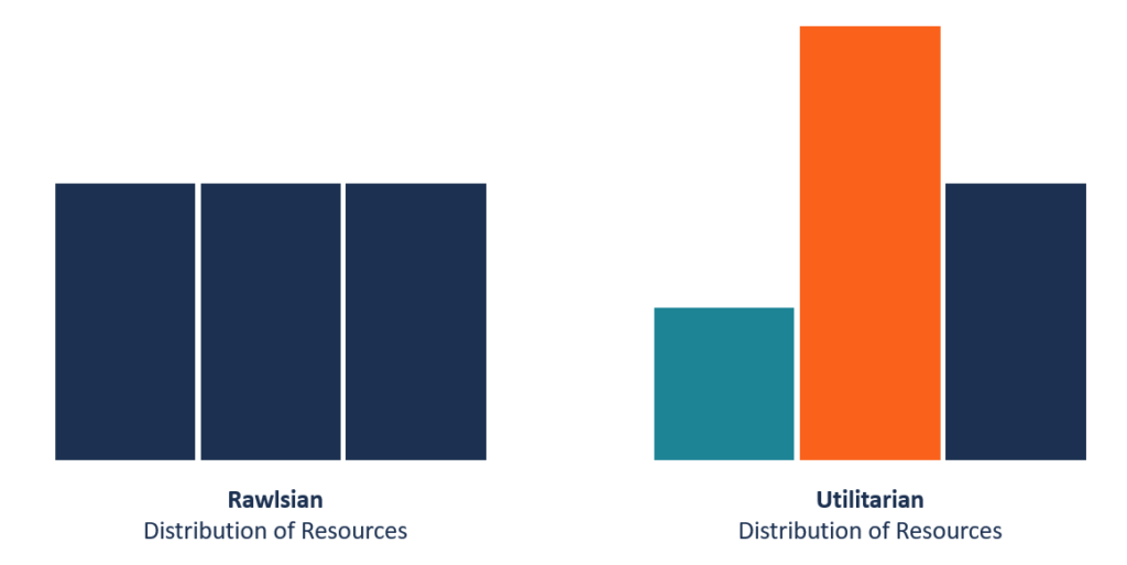 - 羅爾斯認為,資源的平等分配應該是理想的自然狀態,而不是遵循功利主義哲學。