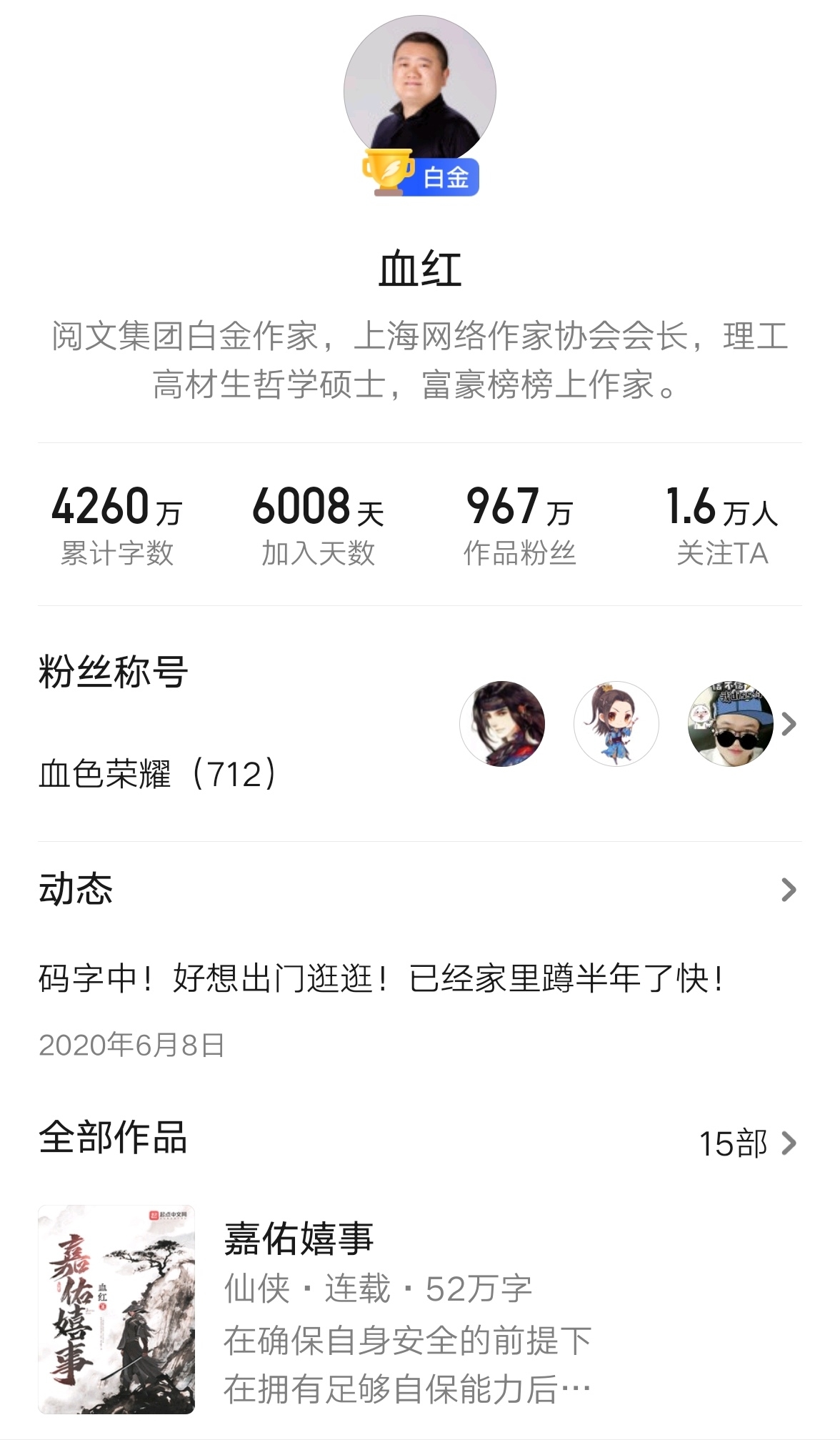可以說(shuō),血紅的創(chuàng)作生涯已經(jīng)走過(guò)了近二十年的時(shí)間,早在2013年,血紅就已經(jīng)跟唐家三少一起進(jìn)駐中國(guó)作家富豪榜。血紅當(dāng)之無(wú)愧的是網(wǎng)文第一批走上致富之路的作家之一了。而時(shí)至今日,血紅仍然能夠活躍在創(chuàng)作之路上,不得不說(shuō)是讀者之幸。