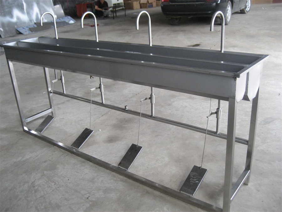 不銹鋼消毒洗手池是用于食品廠工作員工進入車間前的洗手消毒的,采用腳踏式無須手部接觸直接出水方式,防止二次污染,符合食品廠SC認證需求。不銹鋼消毒洗手池可來圖定做,也可根據需求由我司出圖,尺寸、樣式、功能可根據要求定做。