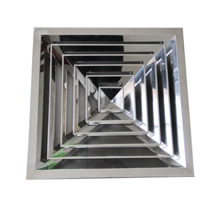 方形散流器為不銹鋼制做,表面經過不銹鋼拋光處理。也可按用戶要求進行烤漆或靜電噴塑,顏色按用戶選擇。還可以按用戶要求配上調節閥或過濾網。方形散流器有四面吹,三面吹,二面吹等幾種出風形式。三面吹散流器適于安裝在靠墻較近的天花板上,二面吹散流器適于安裝在墻角附近的天花板上,用戶可根據安裝位置選用不同出風方向的散流器。