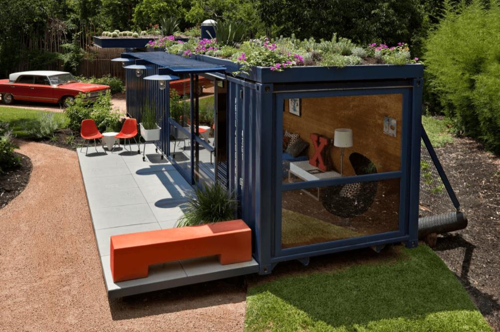 雖然這個小鋼棚的面積只有320平方英尺,但看起來相當舒適。尤其是作為一個溫暖的,木鑲板的招待所,放在你的后院。這個舊的集裝箱只有8英尺寬,40 英尺長, 這只是足夠的空間擠進折疊床、一些椅子、水池和浴室。不過最好的特色是安裝在屋頂上的花園空間。