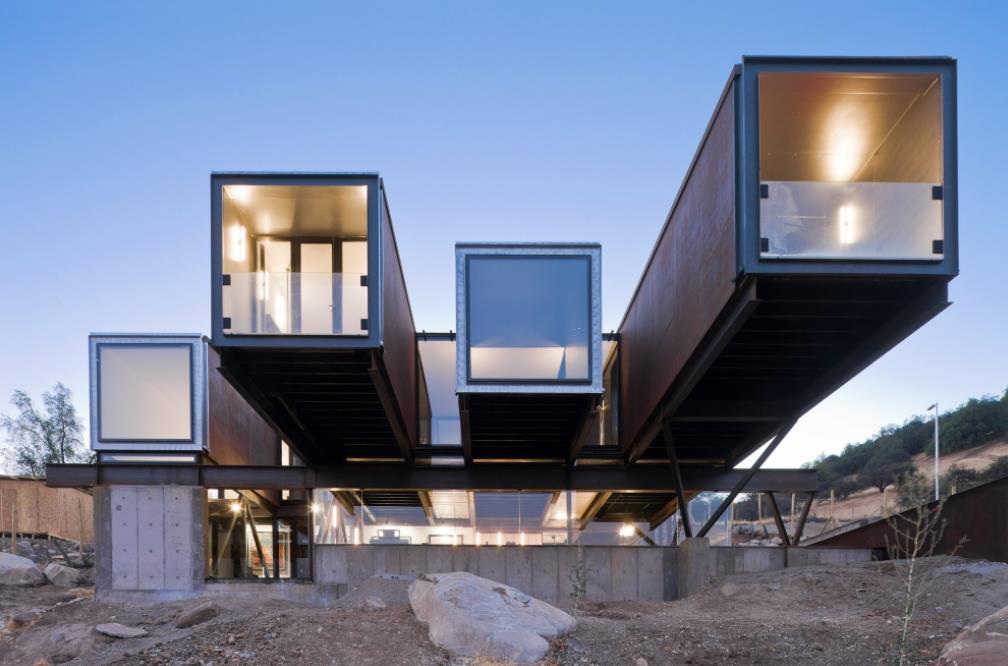 這種美景坐落在智利的巖石山坡上,就在圣地亞哥城外。雖然是用 1 2個海運集裝箱制造的,但很容易被誤認為是價值數(shù)百萬美元的豪宅。它的特點是一個被動通風系統(tǒng),利用從下面的溝渠的自然氣流冷卻房屋,使電子空調沒有必要。內飾和橋接部件非常重鋼,內部有一種時尚的現(xiàn)代感覺。