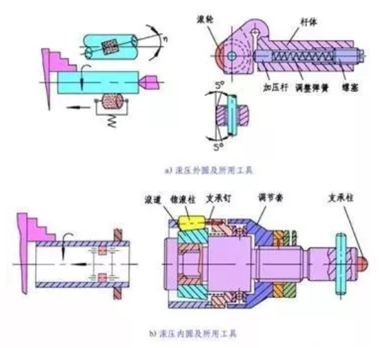 滾壓是在常溫下用硬質滾柱或滾輪施壓于旋轉的工件表面,并沿母線方向移動,使工件表面塑性變形、硬化,以獲得準確、光潔和強化的表面或者特定花紋的表面處理工藝。