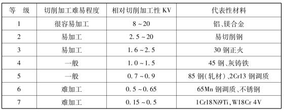 材料的切削加工性能也是選材的重要指標,一般以相對切削加工性指標KV表示,即以45鋼的切削難易程度為1,其他金屬相對于它的切削難易程度的比值確定,見表1.5.20。數值越大,越易加工。