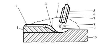 1—已凝固的焊縫金屬 2—熔渣 3—熔化金屬4—焊條藥皮燃燒產(chǎn)生的保護氣體 5,7—焊條藥皮6—焊條芯 8—電弧 9—金屬熔滴 10—母材