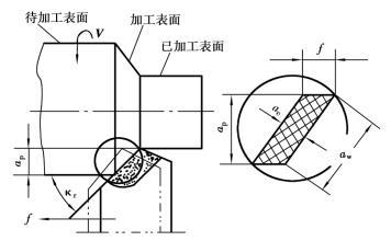 切削寬度是指刀具主切削刃與工件的接觸長(zhǎng)度(mm)。車削時(shí),若車刀主切削刃與工件軸線之間的夾角為κr,則切削寬度為: