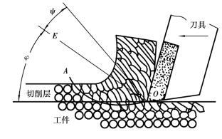 金屬的切削過程也就是切屑形成的過程。如圖5.1.18所示,切削塑性金屬時,當工件受到刀具的擠壓以后,切削層金屬在始滑移面OA以左發生彈性變形,越靠近OA面,彈性變形越大。在OA面上,應力達到材料的屈服強度σs,則發生塑性變形,產生滑移現象。隨著刀具的繼續移動,原來處于始滑移面上的金屬不斷向刀具靠攏,應力和變形也逐漸加大。在終滑移面OE上,應力和變形達到最大值。越過OE面,切削層金屬將脫離工件母體,沿前刀面流出而形成切屑,完成切離。OA與OE之間經過塑性變形的金屬晶粒沿大致相同的方向伸長,晶粒伸長的方向不與OE重合,而成一個ψ角。OE與切削速度方向之間的夾角φ稱為剪切角(也稱滑移角)。