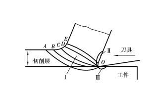 切削塑性金屬材料時有3個變形區。在圖5.1.19中,OA與OE之間是切削層的塑性變形區Ⅰ,稱為第一變形區(或稱基本變形區)。該區的變形量最大,常用它來說明切削過程的變形情況。切屑與前刀面摩擦的區域Ⅱ稱為第二變形區(或稱前刀面摩擦變形區)。切屑形成后與前刀面之間存在很大的壓力,沿前刀面流出時必然有很大的摩擦,因而使切屑底層又一次產生塑性變形。工件已加工表面與后刀面的摩擦區域Ⅲ稱為第三變形區(或稱已加工表面摩擦變形區)。