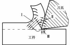 切削過程中,變形抗力和摩擦阻力所消耗的功絕大部分都轉變為熱能稱為切削熱。切削熱來源于3個變形區。如圖5.1.24所示,在第一變形區內,由于切削層金屬發生彈性變形和塑性變形而產生大量的熱量;在第二變形區內,由于切屑與前刀面摩擦而產生熱量;在第三變形區內,由于工件與后刀面摩擦而產生熱量。切削塑性金屬時,切削熱主要來自Ⅰ、Ⅱ變形區;切削脆性金屬時,切削熱主要來自Ⅰ、Ⅲ變形區。