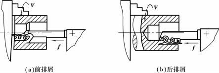 鋼件上鏜孔時(shí),切屑的流向?qū)椎募庸べ|(zhì)量影響較大。精鏜通孔時(shí),最理想的是圖5.2.6 (a)所示的前排屑方式。鏜刀刃傾角取正值,切屑流向待加工表面,從孔的前端口排出,避免切屑劃傷已加工表面。精鏜盲孔時(shí),為避免切屑堆積在孔內(nèi)破壞已精加工的表面,一般采用圖5.2.6(b)所示的后排屑方式。這時(shí),刃傾角取負(fù)值,使切屑順利從孔口及時(shí)排出。