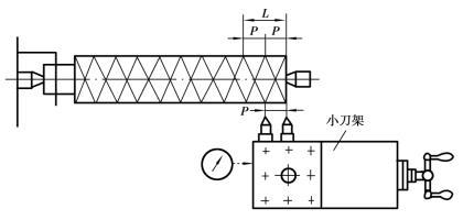 ①移動(dòng)小刀架法 移動(dòng)小刀架法如圖5.2.19所示。首先校正小刀架導(dǎo)軌,使之與工件軸線平行。按螺紋導(dǎo)程L調(diào)整車床,車出第一條螺紋槽,然后讓車刀沿工件軸向移動(dòng)一個(gè)螺距值,即可車削第二條螺紋槽,類推。若多線螺紋的螺距要求不高,可直接利用小刀架手柄刻度盤控制移動(dòng)量;若螺距要求較高,可用百分表控制小刀架的移動(dòng)量。應(yīng)當(dāng)指出,移動(dòng)小刀架時(shí)與當(dāng)時(shí)小刀架所處的軸向位置無關(guān)。