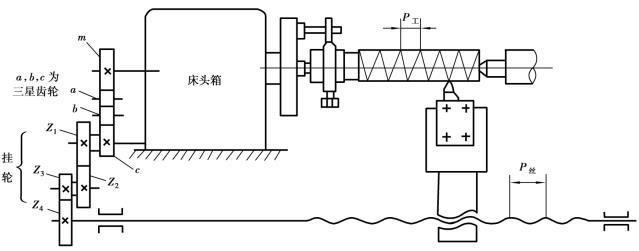 圖5.2.17是無進(jìn)給箱車床從主軸到絲杠的傳動(dòng)系統(tǒng)圖。車螺紋時(shí),主軸的旋轉(zhuǎn)運(yùn)動(dòng)通過其尾端齒輪m、三星輪a,b,c和掛輪Z1,Z2,Z3,Z4傳給絲杠。由于齒輪m,c的齒數(shù)相同,所以三星齒輪只改變絲杠轉(zhuǎn)向,不改變系統(tǒng)的傳動(dòng)比。那么,主軸與絲杠之間傳動(dòng)比的調(diào)整,只需要更換不同齒數(shù)的掛輪即可。設(shè)車床絲杠的轉(zhuǎn)數(shù)為n絲,絲杠的螺距為P絲,工件的轉(zhuǎn)數(shù)為n工,工件的螺距為P工。當(dāng)工件隨主軸旋轉(zhuǎn)一圈時(shí),車刀移動(dòng)的距離必須正好等于工件的螺距P工。即