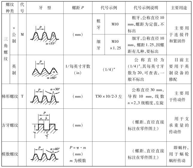 螺紋的種類很多,幾種常見螺紋的代號(hào)、牙型、螺距及主要用途見表5.2.2。