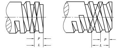 螺紋的基本要素有牙型角α、螺距P和中徑d2(D2)。螺紋按旋向可分為右旋螺紋和左旋螺紋,按螺旋線數(shù)目可分為單線螺紋和多線螺紋。圖5.2.13中,ψ為螺旋升角,是螺旋線的切線與垂直于圓柱體軸線截面的夾角;β為螺旋角,是螺旋線的切線與圓柱體軸線方向的夾角,L為導(dǎo)程,是螺旋線繞圓柱體一周在軸線方向所間隔的距離。在圖5.2.14中,當(dāng)多線螺紋的線數(shù)為n時(shí),導(dǎo)程L與螺距P的關(guān)系為: