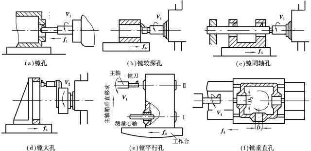 鏜孔是鏜床鏜削加工最主要的工作,同時鏜床還可進行鉆孔、擴孔、鉸孔、鏜孔、切槽、車外圓、車端面和銑平面等工作,如圖5.2.38所示。工件在鏜床上多采用壓板、螺栓裝夾。由于鏜床的萬能性好,鏜床是大型箱體零件的主要加工設備。