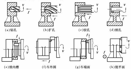 如圖5.2.38(a)~(c)所示,與鉆床上一樣,用裝在主軸錐孔內(nèi)的適當?shù)毒呖蛇M行鉆孔、擴孔和鉸孔。加工時,主軸帶動刀具作旋轉(zhuǎn)的主運動,并作軸向的進給運動,而工作臺不動。加工數(shù)個平行孔時,順序與鏜孔相同。