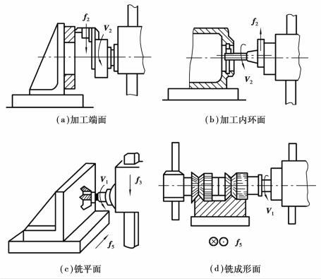 ①加工孔的端面和內(nèi)環(huán)形槽 當使用單刃鏜刀時,主運動是平旋盤的旋運轉(zhuǎn)動,進給運動是徑向刀架在平旋盤上的徑向移動,如圖5.2.40(a)、(b)所示。