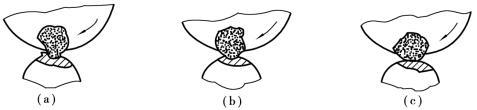 磨削是用分布在砂輪表面上為數甚多的磨粒進行切削的。磨粒的幾何形狀差異很大,排列很不規則,間距和高低隨機分布,具有很大的負前角,棱尖有微小圓弧。如圖5.2.68所示,比較凸出和鋒利的磨粒,能起切削作用,如圖5.2.68(a)所示。凸起高度較小或較鈍的磨粒只能在工件表面刻畫出細微的溝紋,工件材料被擠向兩旁而隆起,如圖5.2.68(b)所示。磨鈍或比較凹下的磨粒只在工件表面進行滑擦,如圖5.2.68(c)所示。