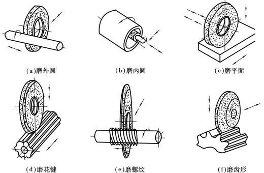 磨削的應(yīng)用十分廣泛,不但可以磨削內(nèi)外圓柱面、內(nèi)外圓錐面、臺(tái)肩端面、平面,還可以磨削螺紋、齒形、花鍵等成形面,如圖5.2.71所示。磨削加工精度高,表面質(zhì)量好,且可加工高硬度材料。