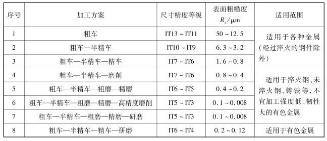 外圓表面是軸、盤套類零件的主要表面之一,其技術要求一般包括表面粗糙度、尺寸精度以及相應的圓度、圓柱度、同軸度等形位精度。常用的外圓加工方法有車削、磨削、研磨和超精加工等。各種精度的外圓表面的加工方案見表5.3.3。