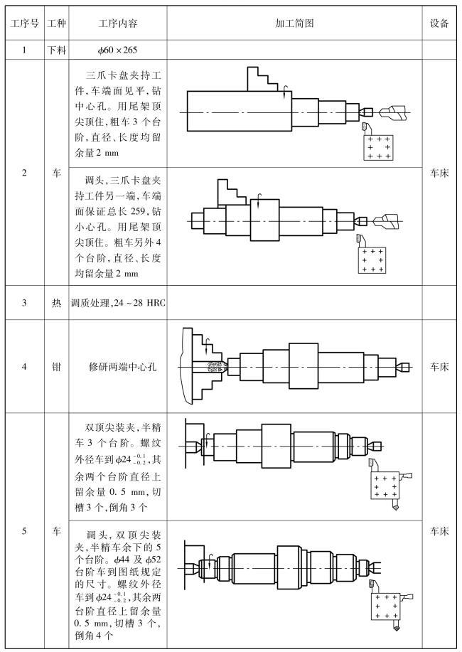 定位精基準(zhǔn)中心孔應(yīng)在粗車(chē)之前加工,在調(diào)質(zhì)之后和磨削之前各需安排一次修研中心孔工序。前者為消除中心孔的熱處理變形和氧化皮;后者為提高定位精基準(zhǔn)的精度和減小表面粗糙度。擬訂零件的工藝過(guò)程時(shí),在考慮主要表面加工的同時(shí),還要考慮次要表面的加工。半精車(chē)階段,外圓φ52達(dá)到圖紙規(guī)定的尺寸,同時(shí)加工出各退刀槽、倒角和螺紋;3個(gè)鍵槽應(yīng)在磨削之前銑出。