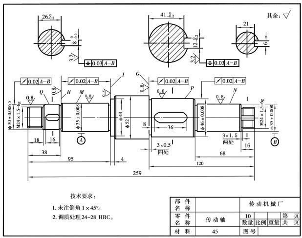 傳動(dòng)軸大都是回轉(zhuǎn)表面,應(yīng)車(chē)削成形。由于該軸的主要表面M,N,P,Q的精度等級(jí)較高(IT6)、粗糙度較低(R a= 0.8),車(chē)削后還需進(jìn)行磨削。這些表面的加工順序應(yīng)該是:粗車(chē)—半精車(chē)—磨削。